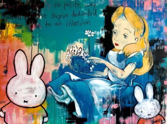 Cohen is unafraid to tackle serious issues in her own honest, compelling way. Her work is often boldly (and sometimes darkly) ironic, taking messages about the greater world around us and combining them with beloved childhood characters and pop culture icons. In her piece above, “There’s Simply No Polite Way…”, Cohen takes beloved character Alice from “Alice in Wonderland” and gives her a darker edge, both metaphorically and in the literal sense, surrounding Alice with black paint. And while her piece “No Church in the Wild” (seen above) lacks the colorful variety of some of her other pieces, in it Cohen embraces her darker side. She combines the wild and the civilized, painting the head of a wild animal on the body dressed in a suit. The juxtaposition fits perfectly with the quoted line from Kanye West and Jay-Z’s song for which the painting is named.